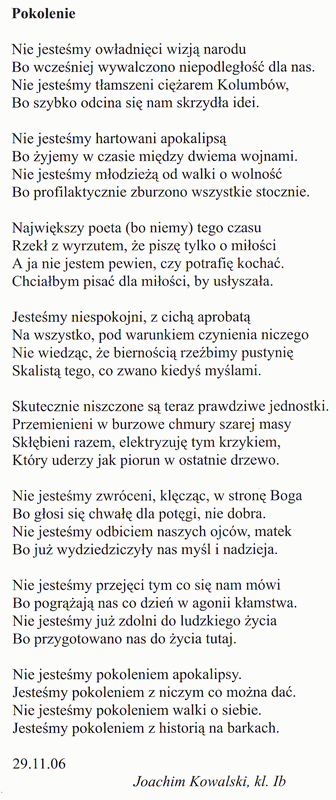 Praca nagrodzona w konkursie "Na rogu Świętokrzyskiej i Nowego Światu" "Ze spuszczoną głową, powoli... Idzie..." Uczeń bezwolnie do szkoły. Róg Świętokrzyskiej i Nowego Światu. Tam właśnie niechętnie kieruje swe kroki. Już widać różowo-żółty budynek, wyróżniający się z szeregu szarych, zakurzonych smętnie tkwiących wzdłuż ulicy. Coraz bliżej wejścia, coraz większy ruch. Wokół głowy, szepty, czasem śmiechy. Z gwaru można wyłonić pojedyncze słowa lub całe rozmówki. - Odrobiłeś pracę domową? - Uhm. - Dasz odpisać? - Noo. - Super, bo wiesz, jakoś wczoraj nie miałem czasu. A z drugiej strony słychać: - O Metro, Metropol - daj jeden, poczytamy ploteczki -.To odezwał się jakiś miłośnik prasy brukowej. Bez entuzjazmu, ale karnie wszyscy zmieniają swoje buty na pseudo-gustowne kapcie o regulaminowym wyglądzie. Już za chwilę słodko brzmiący dla pani woźnej tupot gumowych bucików rozlega się na schodach. Grupki uczniów już od samego rana rozpoczynają swój marsz do matecznika wiedzy - KLASY. 8.15 - godzina zero. Dla rozruszania towarzystwa, na dzień dobry, przywitanie z królową nauk. Już profesor od matematyki zadba o to, aby każdy zapamiętał permutacje, wariacje, aksjomaty. Jednak tutaj aksjomat jest tylko jeden - niechęć do tego przedmiotu. Kilka osób stara się nadążyć za naukowymi wywodami, a reszta z przerażeniem śledzi ruchy wskazówek zegara. Niech no tylko się już wreszcie to skończy. O! Cóż za miły dźwięk. Dzwonek. Przerwa - co za ulga. Trzeba szybko doczytać ten artykuł w "Metropolu" - to jakaś duża afera i na pewno ciekawsza od kombinatoryki. Śmieszne? Chyba nie za bardzo. Tak jednak wygląda nie tylko lekcja matematyki. I nie tylko na rogu Świętokrzyskiej i Nowego Światu. Idę sobie korytarzem - nawet ładny. Tu i tam stoją lśniące, wypolerowane puchary. To zdobycze nielicznych pasjonatów. Jednak daty na nich są okrutne - to nie nasze czasy. To nasi poprzednicy mieli jakieś odruchy walki i dążenia do dominacji. Teraz na topie jest marazm i narzekanie. "Ale mi się chce spać...", " O rany, ale nudy. Kiedy wreszcie skończą się te lekcje!?" Co się stało? Dlaczego tak wyglądają kolejne dni w zabytkowym gmachu? Dlaczego brak jest społeczników typu "Zoja" z filmu " Dom"? Czasami wydaje mi się, że każde zachowanie ma swój czas, swoją epokę, ale pewne wartości nie powinny wyginąć do końca. W przyrodzie, jak coś jest zagrożone, to podejmuje się cały szereg działań ochronnych. W tym przypadku zagrożona jest tożsamość ucznia - jego pasje i zainteresowania. Nadmiar i natłok wielu zbędnych wiadomości wtłaczanych do głów sprawia, że na to, co najcenniejsze, nie zostaje czasu i miejsca. Są nieliczni ludzie, którzy może chcieliby coś robić. Niestety, ich los jest przesądzony - rozmywają się w tłumie bezideowców, nie znajdują poparcia, są niemodni, niedzisiejsi. Jakież to wygodne - tak sobie siedzieć opartym o ciepły kaloryfer i czekać spokojnie na następną lekcję. Po co miałbym tworzyć jakieś dekoracje, gazetki, teksty, udzielać się gdzieś? Bieganie tu i tam - same problemy, człowiek zgrzany, spocony... A tak - cisza, spokój. Jakoś dotrwa się do tej 14.35. W tłoku, byle szybciej dopchać się do szafki, zrzucić obciachowe kapcie i do domu. Dzień jak co dzień - mój, kolegi, koleżanki ... Ale dzisiaj było coś nowego. Gość z historii nawet ciekawie mówił. Widać, że ma pasję. Udało mu się ożywić nawet największych klasowych śpiochów. Może warto by było poczytać coś więcej na ten temat? Ale, nie... dzisiaj ciężki dzień - chyba ciśnienie spada czy co? Poczekamy, zobaczymy. Czy to był tylko jednodniowy zryw, czy nadal będzie się starał? O! Nadjeżdża autobus. Małe postanowienie na dziś, bo muszę pędzić na przystanek. Jak on - tzn. profesor - będzie ciekawie mówił, to ja też postaram się tym zająć. Swoją drogą, gdyby było więcej takich, mogłoby być w szkole nawet ciekawie. I czas by szybciej leciał. Oddalam się od rogu Świętokrzyskiej i NowegoŚwiatu. Oglądam się za siebie i myślę - wygląda nawet niczego sobie. Byłby z niego niezły rezerwat dla zagrożonego gatunku uczniów z pasją i profesorów - zapaleńców. Aleksandra Świątek