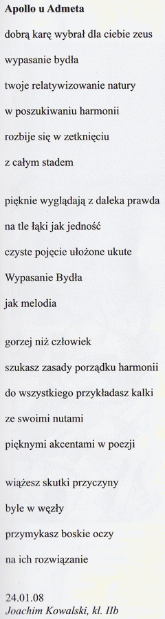 Finał śródmiejskiego Festiwalu Młodych Talentów 28. kwietnia przywitał nas ciepło: uśmiechem na twarzy i miażdżącym uściskiem dłoni. Był to dzień gali w "Romie" i rozdania dyplomów dla laureatów konkursów młodych talentów. Jak przekonują organizatorzy, wzięło w nim udział 1700 uczniów (czyli ~0.1% populacji stolicy ), z czego całe trzynaście osób - z XXXVII LO. Pod teatrem była nas ósemka: pani profesor Kniaziołucka, pani profesor Trojanowska, członek Rady Rodziców, dwie osoby z grupy teatralnej, dwie nie wiadomo skąd i 28. kwietnia. W holu byliśmy bardzo zaaferowani szukaniem wejścia do loży, więc nie przyjrzeliśmy się zbyt dokładnie pracom nagrodzonym w konkursach: fotograficznym, plastycznym i literackim. Zostały one zaprezentowane już wcześniej, w Galerii Twórczości Dzieci i Młodzieży Domu Kultury "Muranów", podczas wręczania nagród. Podobnie - występy grup teatralnych, w tym naszej, które można było zobaczyć w Domu Kultury Śródmieście blisko tydzień wcześniej. Tego dnia atrakcją były jednak występy laureatów konkursów: muzycznego i tanecznego we wszystkich kategoriach (szkół podstawowych, gimnazjalnych i ponadgimnazjalnych). Gala rozpoczęła się uroczystym rozdaniem dyplomów, za co chwała sekcji logistycznej: specyfika ludzi na stanowiskach jest bowiem taka, że nie wychodzą na scenę, jeśli konferansjer bez pomyłki nie wymówi ich kilkunastocalowych tytułów, a kilka takich osób miało rzeczone dyplomy rozdać. Jest to najnudniejsza części takiej imprezy i gdyby przesunięto ją na koniec, prawdopodobnie zrobilibyśmy VIP-om przykrość, wychodząc. Wtedy to w naszej loży rozgorzała dyskusja na temat idealizmu socjalistów, przemiany energii w masę i budowy otoczek mielinowych wokół aksonów. We właściwej części koncertu największe emocje wzbudzało dziewczę z jednej ze szkół podstawowych, które swoją piosenkę jazzową uświetniało... "niecodzienną" - to odpowiednie słowo - uświetniało niecodzienną choreografią. Pośród laureatów konkursu muzycznego znalazła się też grupa rockowa oraz kilka - niestety - identycznie śpiewających wokalistek. W konkursie tanecznym najpopularniejsze były układy dla grup (zresztą niektóre naprawdę dobre, choćby zespołu EKONOM, którego prowadzący zdobył wyróżnienie), lecz, prawdopodobnie przez częstość występowania tego zjawiska, stały się tłem dla prawdziwie oryginalnych tancerzy - Ernestiny Papazyan, która zaprezentowała taniec ormiański czy Mateusza Mroczka z zespołem tańczących hip-hop. Uwagę publiczności zwróciły także młode damy z jednej ze szkół podstawowych, które zaprezentowały układ zatytułowany... "Moulin Rouge". Jak widać - atrakcji na galach tego typu nie brakuje, głównie dzięki kreatywności młodzieży i jej odwadze. Wychodząc z teatru, oddychałem lekko - uczucie, że wzięło się udział w takim przedsięwzięciu, daje naprawdę dużo radości. Wbrew pozorom - młode talenty, mimo pewnych technicznych niedociągnięć, są elementem sztuki najbardziej niezależnym. W tej twórczości nie ma niezdrowej konkurencji, komercji, dzieła nie są "produkcyjniakami XXI w." i nie wyrażają kiczowatych, pseudofilozoficznych myśli. Nawet sztuczność wydaje się naturalna. Polecam sprawdzenie tego osobiście - koszta żadne, a przyjemność można zrobić i sobie i młodym artystom. Tymoteusz Oleniecki, kl. III F