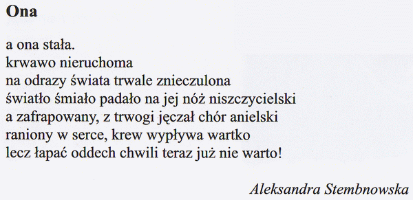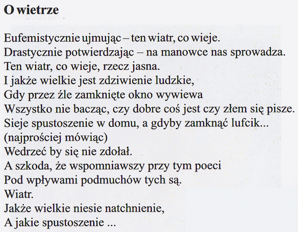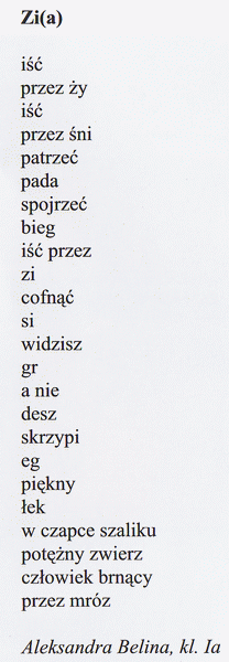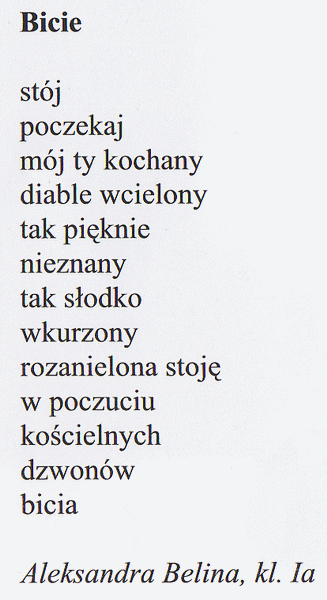 czyli o nauce, sztuce i szkole, czyli krótki literacki komentarz do gabloty klasy 2b Na pierwszej lekcji, w szczególności poniedziałkowej, większość uczniów trwa w lekkim otępieniu. Stan ten spowodowany jest po pierwsze Szokiem Poweekendowym (zespołem bezwarunkowych odruchów wywołanych nagłą zmianą środowiska na szkolne), po drugie niewyspaniem, po trzecie przemożną chęcią słuchania i aktywnego uczestnictwa w lekcji, co jednak z wyżej wymienionych powodów jest utrudnione, a efekt końcowy nieudanych wysiłków objawia się jako otępienie. Dodatkowo przeciętny uczeń potrzebuje rano (zwłaszcza w poniedziałek) chwili, aby wzmocnić i rozruszać zesztywniałe mięśnie nadgarstka i palców. Niezawodnym remedium na opisane powyżej dolegliwości jest krótki wysiłek artystyczny w trakcie porannego czytania listy obecności. Przykładowo może to być wykonanie obrazka, ryciny bądź wycinanki na marginesie lub ostatniej stronie zeszytu. W ten sposób komórki odpowiedzialne za myślenie zostają pobudzone do działania oraz następuje rozkurcz mięśni palcowo-nadgarstkowych. Organizm zostaje przygotowany do codziennego szkolnego wysiłku. Nieodłącznym czynnikiem zaburzającym prawidłowy rozwój psychofizyczny człowieka jest stres. To stan powszechny w niektórych sytuacjach w szkole. Udziela się większości uczniów na przykład w trakcie oddawania sprawdzianów. Aby zniweczyć zgubne skutki tego stanu, należy wyeliminować myśli będące jego źródłem. Wielu uczniów popiera opartą na licznych doświadczeniach teorię, iż wysiłek twórczy (szeroko pojmowany, na przykład tworzenie mozaiki z obierków temperowanego ołówka albo rysowanie węglem) jest w takich sytuacjach skuteczną metodą pozwalającą na oddalenie się myślami aż do czasu, gdy wyczytane zostanie nazwisko delikwenta będącego autorem sprawdzianu. Czas spędzony w szkole to oczywiście również przerwy oraz zastępstwa. Okoliczności sprzyjają wówczas rozwojowi zdolności twórczych, manualnych i szeroko pojmowanych umiejętności zintegrowanych ucznia. Aby należycie wykorzystać czas, jednostka kreatywna zawsze powinna mieć przy sobie substancje barwiące, dłuta, druty, włóczkę, tkaniny, młotki, igły, obcęgi, ścinki drewniane tudzież papier i ołówek. Ostatnia lekcja (zwłaszcza w piątek) często jest związana z tak zwanym Stanem Napięcia Przedweekenowego objawiającym się nadruchliwością i niemożnością skupienia myśli na przedmiocie rozważań lekcyjnych. Aby przeciwdziałać tej przykrej dolegliwości, uczeń powinien wykonać niewielki wysiłek intelektualny w trakcie sprawdzania listy obecności. Niejednokrotnie napotyka na przeszkody w urzeczywistnieniu tego zamiaru. Najczęściej są to: zaniechanie sprawdzania listy przez nauczyciela oraz wypisanie się długopisu, flamastra lub wkładu w piórze. W obu tych sytuacjach należy maksymalnie wytężyć siłę woli, aktywnie dotrwać do końca zająć szkolnych i kontynuować kreatywne myślenie po powrocie do domu. Z niniejszej rozprawy należy wyciągnąć ważny wniosek, iż każdą chwilę trzeba w pełni wykorzystać na rozwój sztuki i nauki lub dla zdrowia organizmu. Wnioskiem, którego nie należy wyciągać z niniejszej rozprawy jest to, iż lekcje służą rysowaniu po marginesach lub rzeźbieniu cyrklem w gumce do ścierania. Czas na lekcji powinien być przeznaczony przede wszystkim na przyswajanie wiedzy, na sztukę pozostają jedynie chwile, które z założenia nie zostaną poświęcone edukacji. Kto nie dostosowuje się do powyższych zasad, musi być świadom czekających go niechybnie surowych sankcji. Helena Mazur, kl. II B