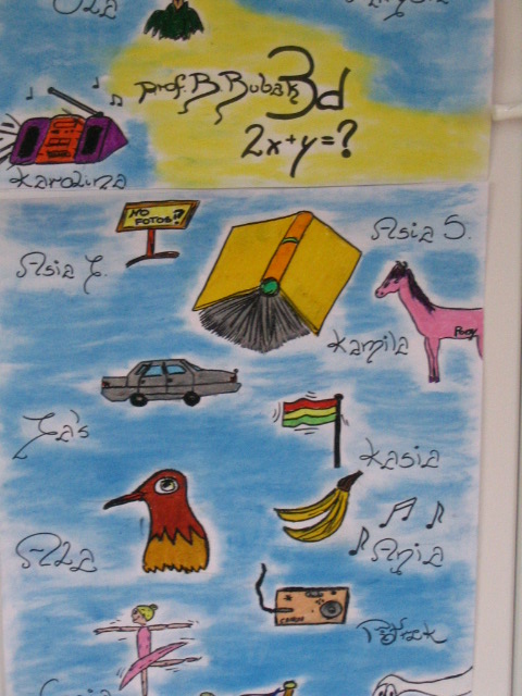 Kliknij, aby zobaczyć większe zdjęcie Nagrody książkowe otrzymali również autorzy komiksu - Jarosław Wojciechowski i Adam Sielatycki z klasy IIA. Praca podejmowała trudny i wciąż żywo dyskutowany problem toalet w naszym LO :-). Jak co roku uczniowie wykazali się świetnymi pomysłami w konkursie "Drzwi do pracowni". Zwycięzcami okazali się uczniowie z klasy IIC, którzy z dużą dbałością o szczegóły w stylu neowięziennym udekorowali salę 212. Podziwiamy ich niespotykaną wprost fotogeniczność. Na wyróżnienie w tej samej kategorii zasłużyła klasa IIIB, która wykazała się szczególną umiejętnością oddania charakteru poszczególnych osób, w tym wychowawczyni, pani prof. Barbary Bubak, określonej mianem "równania z dwiema niewiadomymi". Drugie wyróżnienie otrzymała klasa IIB za fascynujące czarne wrota, prowadzące do sali 206. Niektóre z nowych drzwi do pracowni: