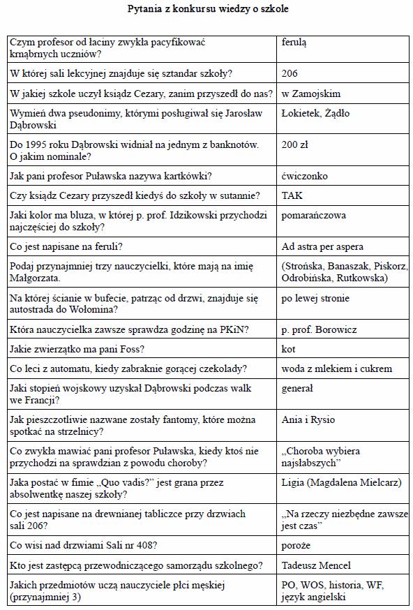 Sezon teatralny - działalność Teatru "Nie-Na-Żarty" - czyli o tym jak uniknąć rodzinnego koszmaru (2008/2009) Biblioteka (2008/2009) Kuźnia kultury (2008/2009) Nauczyciele języka angielskiego na kursie językowo-metodycznym - program Comenius (lipiec 2009 r.) Prawybory do Parlamentu Europejskiego w naszej szkole (01.06.2009 r.) Festiwal Młodych Talentów (29.05.2009 r.) Lekcja historii w Muzeum Woli (30.04.2009 r.) Spotkanie z Panią Hanną Krall (24.04.2009 r.) Wymiana z Włochami - Rieti i rewizyta (luty, kwiecień 2009 r.) Z życia redakcji - lekcja poetycka (30.03.2009 r.) Dzień na TAK (23.03.2009 r.) Wymiana z Włochami - Sycylia (marzec, 2009 r.) Międzynarodowy Salon Edukacyjny PERSPEKTYWY 2009 (05-08.03.2009 r.) Szkolna wycieczka do Londynu (02-08.03.2009 r.) Studniówka (17.01.2009 r.) Wolontariat - Wielka Orkiestra Świątecznej Pomocy (11.01.2009 r.) Jasełka (grudzień, 2008 r.) Dzień Patrona (13.11.2008 r.) Dzień Papieski w XXXVII LO (16.10.2008 r.) Dzień Nauczyciela (14.10.2008 r.) Otrzęsiny klas I (10.10.2008 r.) Wyjazd integracyjny klas I (22-28.09.2008 r., 29.09.-05.10.2008 r.) Wolonatariat (wrzesień, 2008 r.) Wolonatariat (2008/2009)