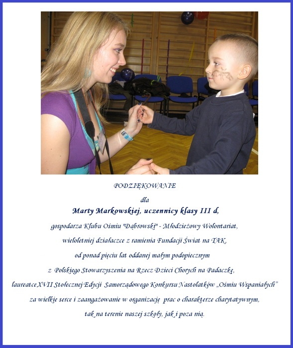 W podziękowaniu za zaangażowanie w pracę o charakterze charytatywnym na terenie naszej szkoły, jak i poza nią, Marta Markowska z kl. IIId otrzymała dyplom od opiekuna Szkolnego Klubu Ośmiu "Dąbrowski" - Młodzieżowy Wolontariat, pani prof. Renaty Tuli.