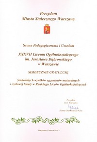 Opracowała: Dominika Sztebner-Rolińska, kl. 1b Gratulacje dla liceum od Prezydent Miasta Stołecznego Warszawy (marzec 2013 r.)