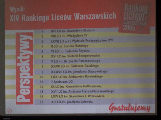 Wyjazd integracyjny do Spały (wrzesień, 2004 r.) Ślubowanie i otrzęsiny klas pierwszych (24. 09. 2004 r.) Biała Szkoła 2005 Studniówka 2005 Pielgrzymka maturzystów do Częstochowy (04. 02. 2005 r.) III Edycja Programu "Dzień na TAK" (21. 03. 2005 r.) Międzynarodowy Salon Edukacyjny PERSPEKTYWY 2005 (marzec, 2005 r.) Pożegnanie Ojca Świętego (04.04. 2005 r.) Wizyta ks. biskupa Tadeusza Pikusa (kwiecień, 2005 r.) Dzień chiński (kwiecień, 2005 r.) Zakończenie roku szkolnego klas III (kwiecień, 2005 r.) Matura 2005 (maj 2005 r.) Wycieczki zagraniczne i wymiany językowe (2004/2005):
